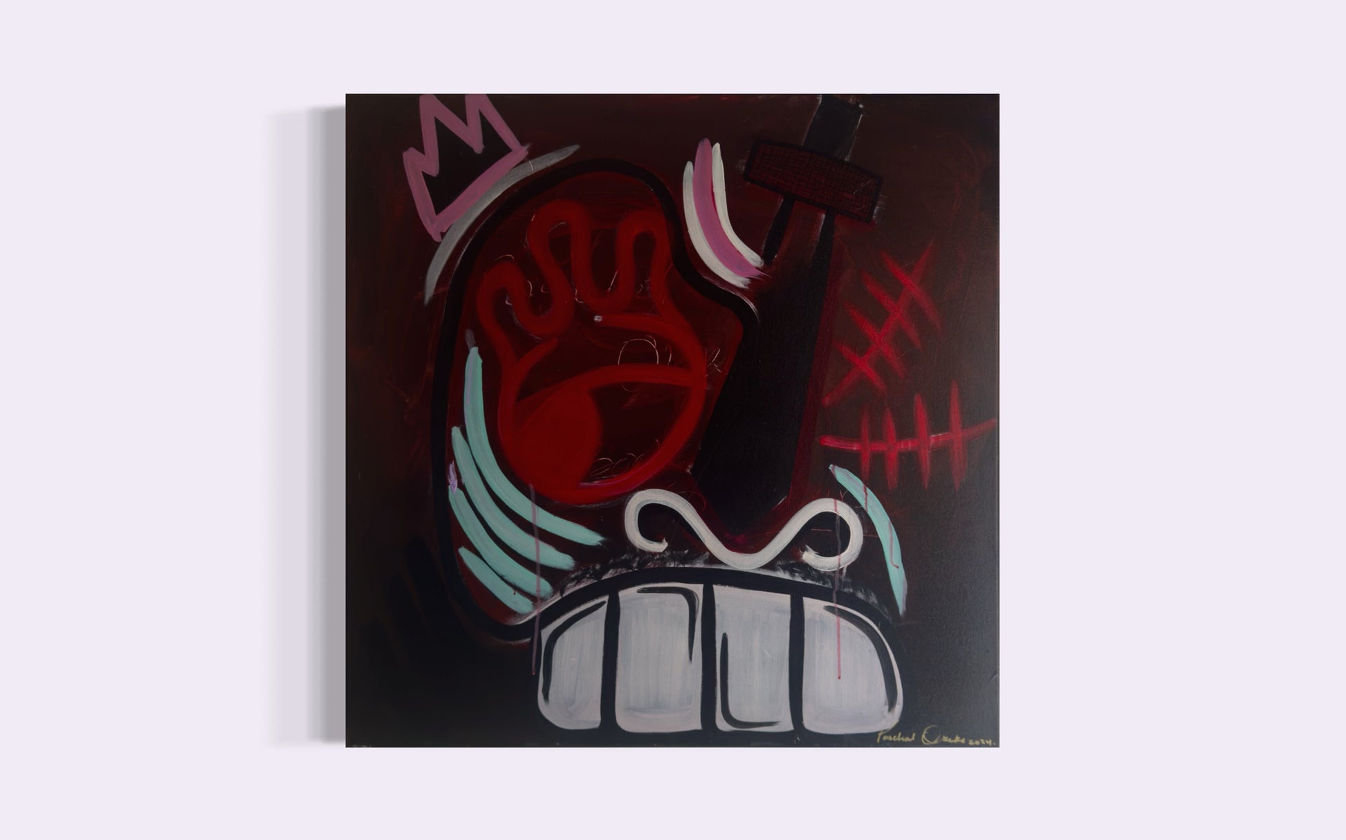 The eyes, blood-red and swollen with fury, don’t plead they accuse. They’re wide open, not in fear, but in the kind of disbelief that comes when the wound is fresh and the knife is still warm. The exaggerated white teeth below are clenched in a grotesque grimace part scream, part silence. It’s the face you wear when you’ve been betrayed but refuse to break.