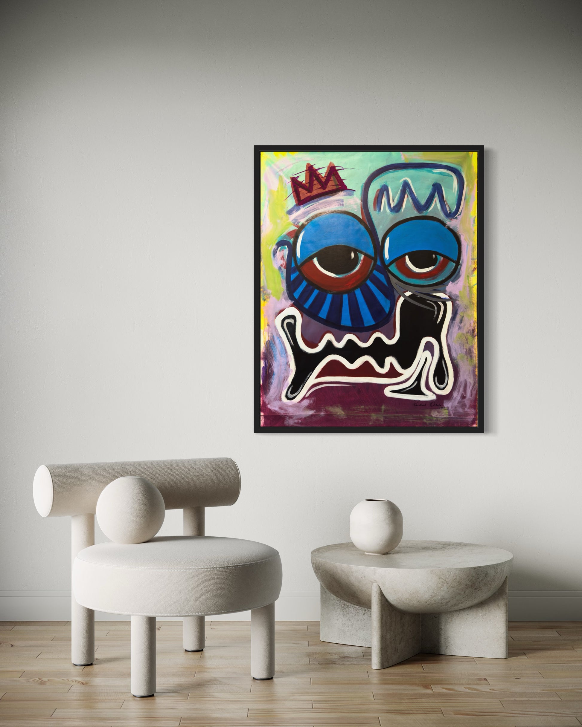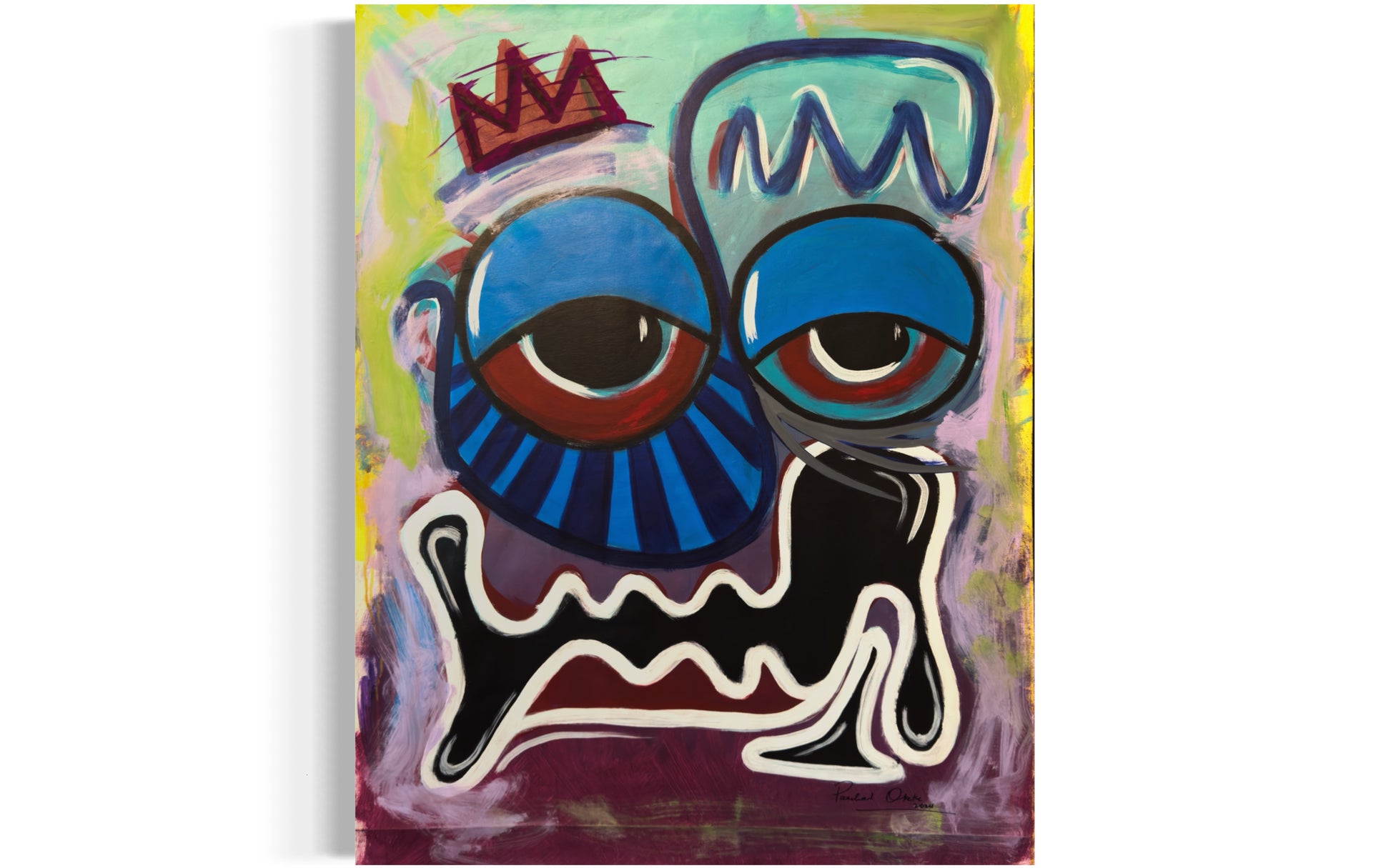 The jagged mouth, stretched into a forced grin or maybe a silent scream, feels like a mask something worn to keep others from seeing the cracks. And that crown? It’s crooked, almost fading, like a symbol of strength that’s barely holding on.