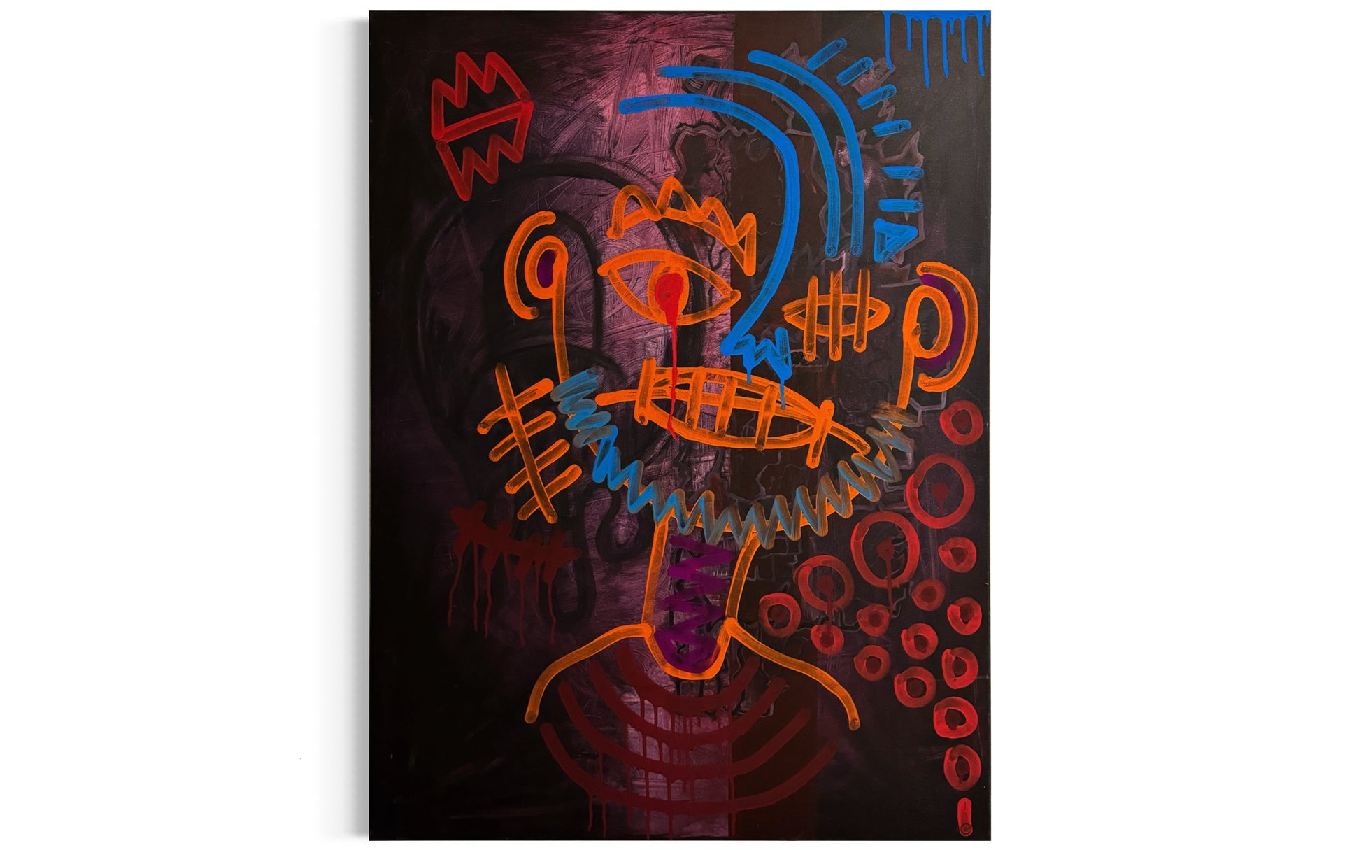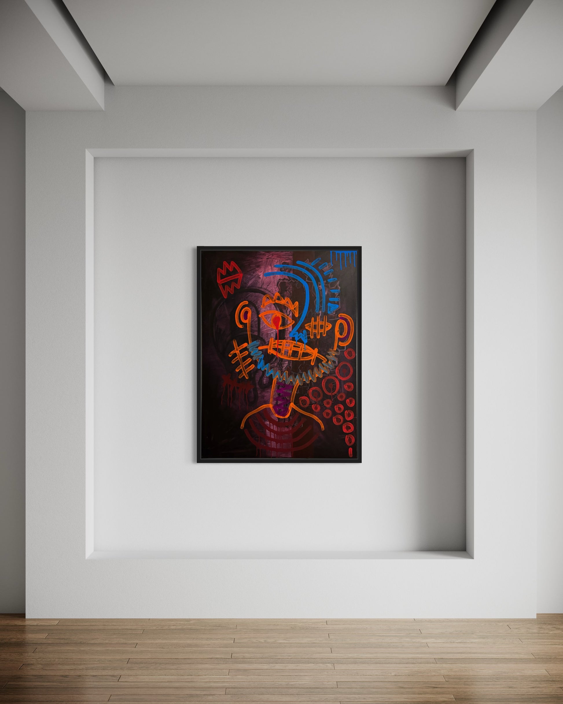 A hauntingly expressive portrait of psychological tension, this painting captures the fragile moment before emotional collapse. With jagged orange lines, a wide, confronting eye, and a caged mouth, the central figure embodies silent anguish. Swirling blue strokes and scattered red symbols evoke mental chaos and trauma, while the bruised background presses in like external pressure. Raw, defiant, and deeply personal, it’s a visual scream wrapped in silence.