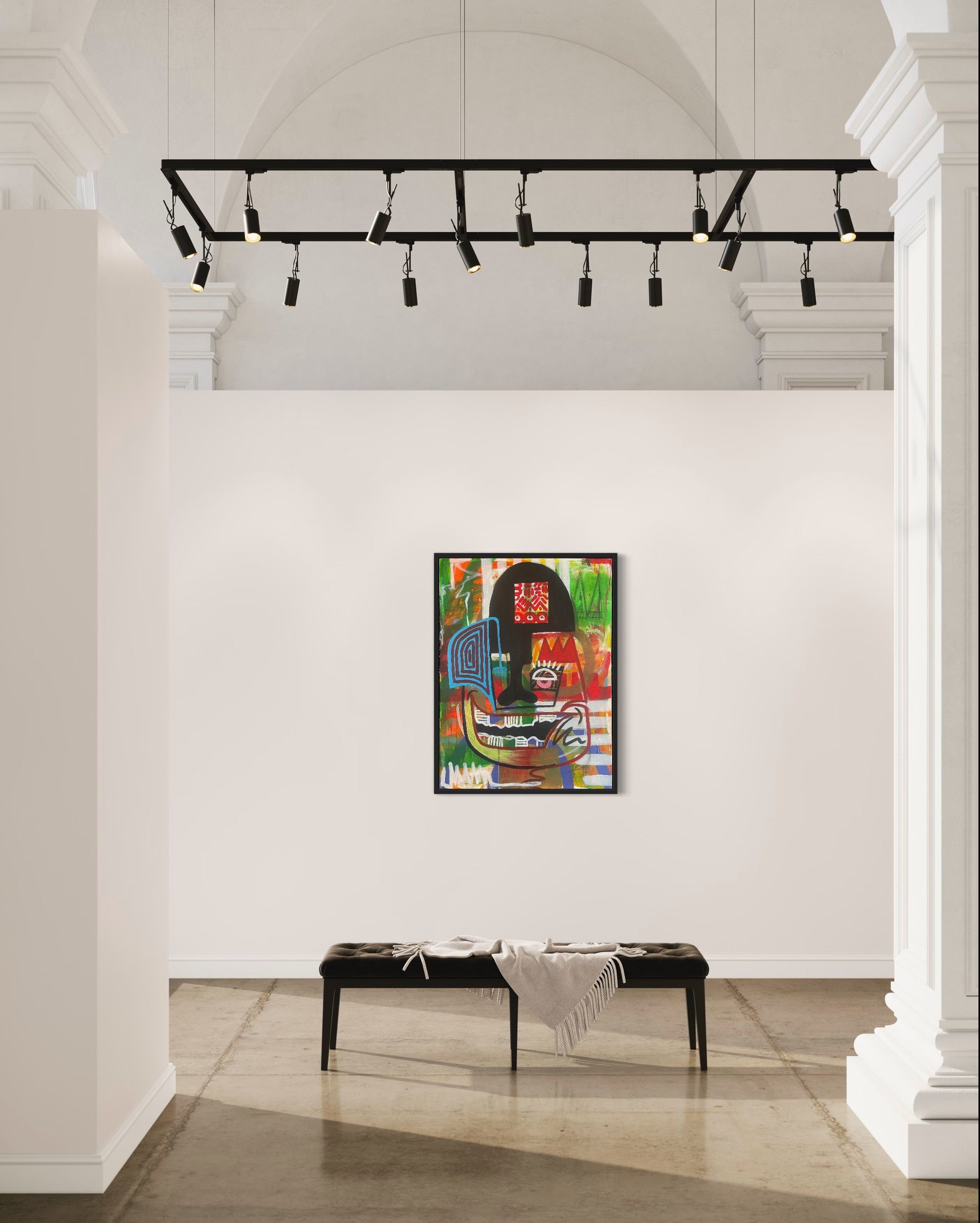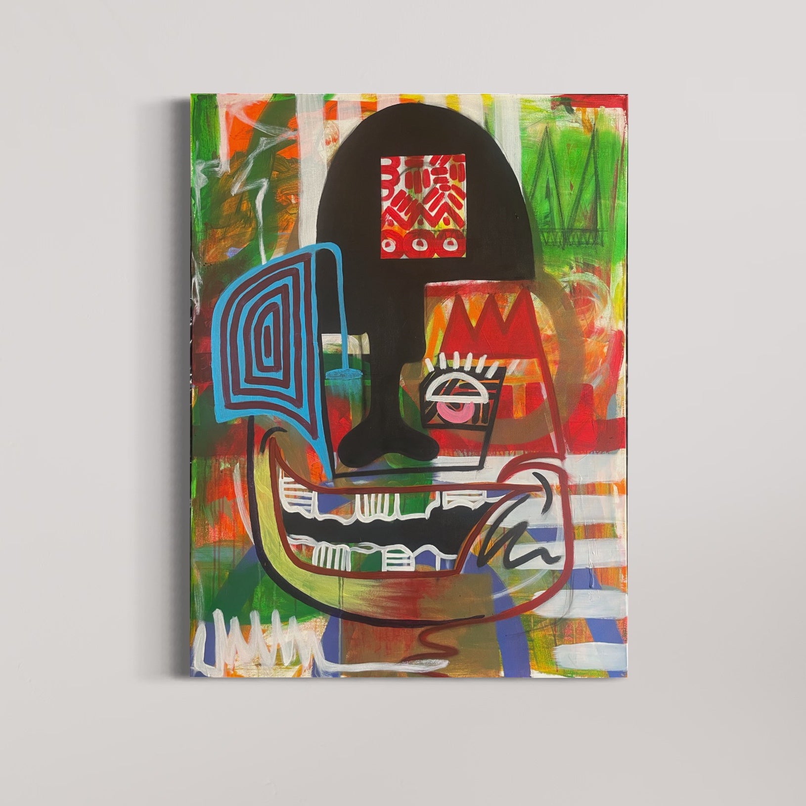 This painting feels like a paradox playful yet unsettling, brilliant yet absurd. The figure’s exaggerated grin and warped features suggest someone who’s lost in their own head, tumbling through loops of thought that don’t always make sense. There’s a kind of foolish joy here, like the kind that masks deeper confusion.