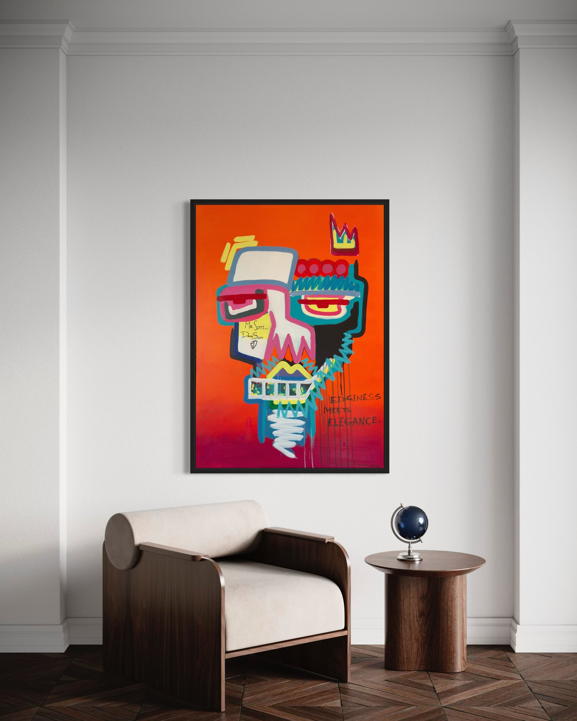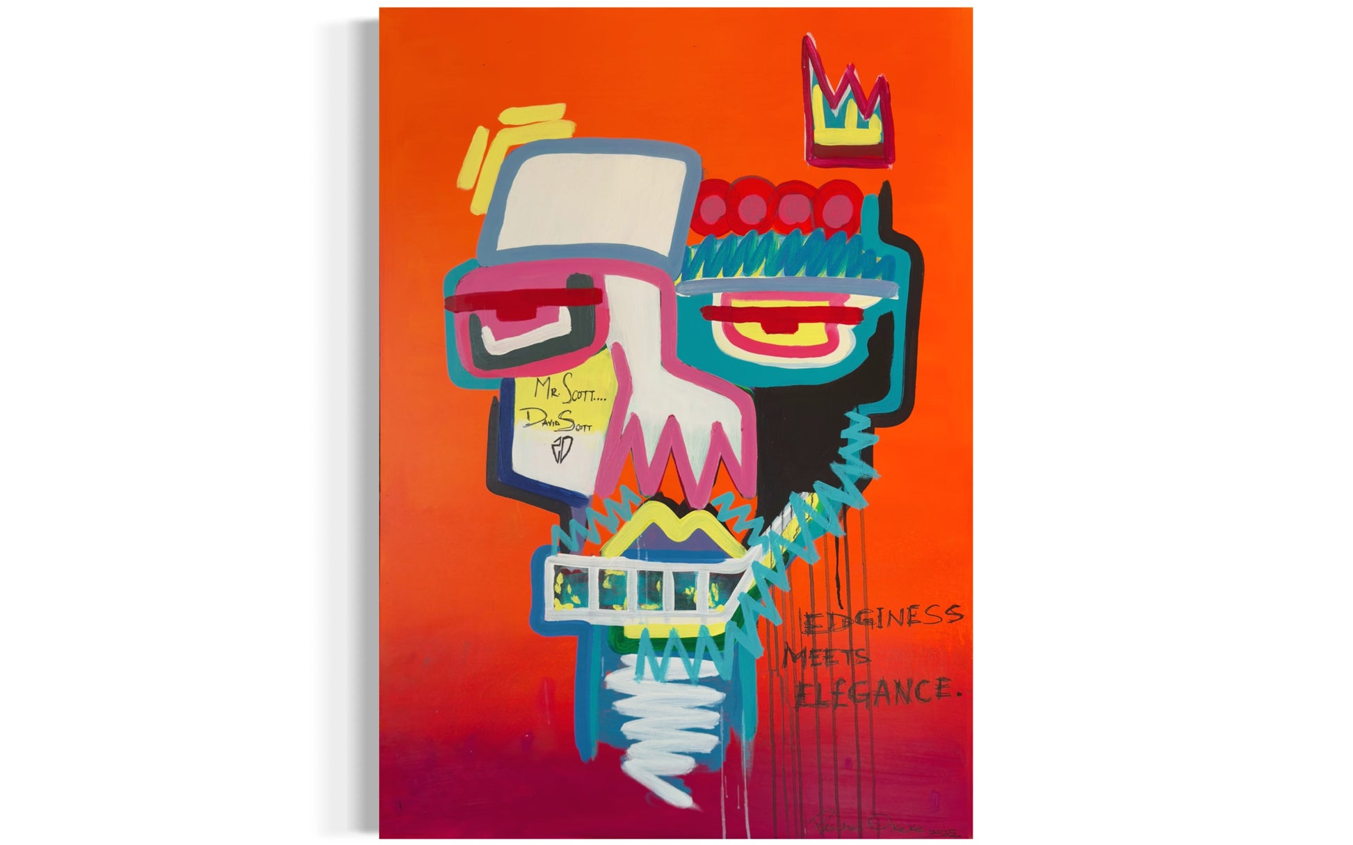 This painting feels like a bold introduction, confident, stylish, and unapologetically unique. The figure commands attention with its sharp lines and vibrant palette, like someone walking into a room knowing exactly who they are. The name scrawled on the cheek, “Mr. Scott…David Scott,” instantly brings to mind that iconic Bond swagger. It’s playful, but also deliberate. This is a man proud of his journey and ready for what’s next.