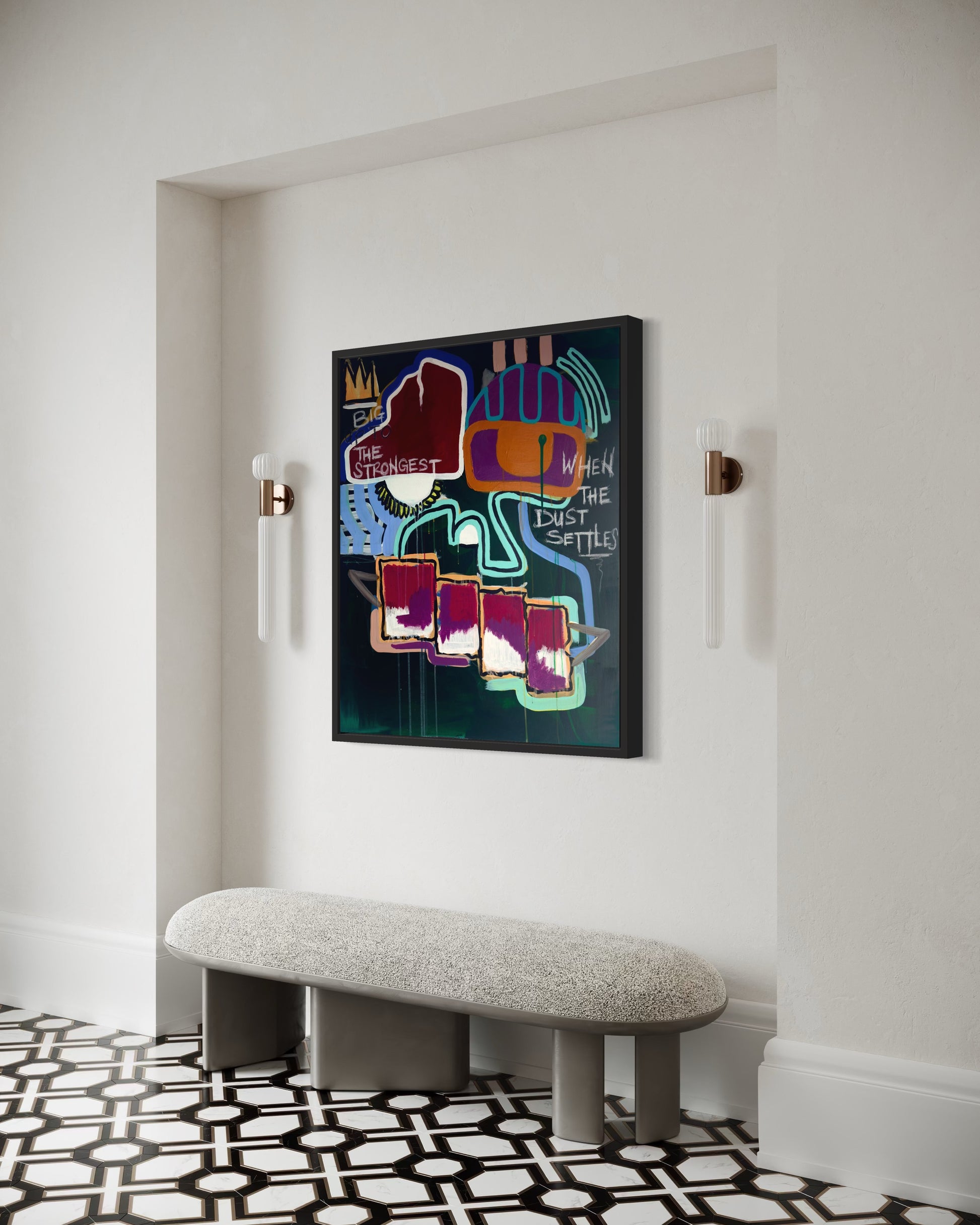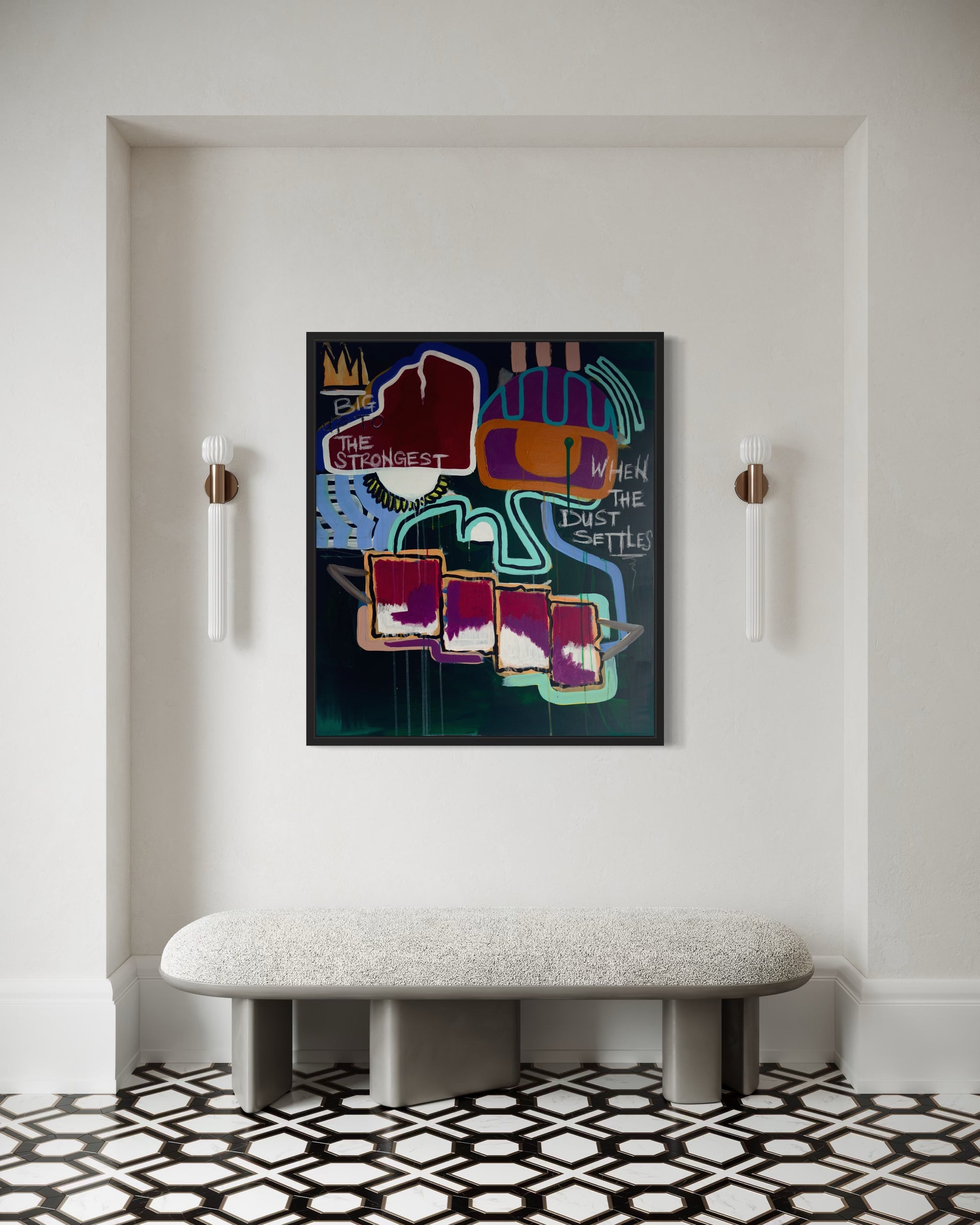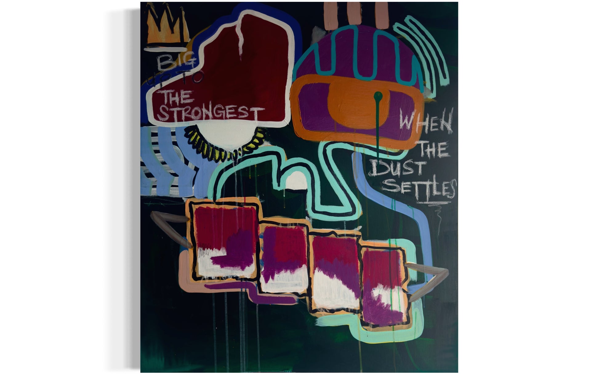 The deep reds and purples bleed with intensity, anchored by bold strokes that suggest both pain and power. The crown in the corner isn’t boastful it’s earned, a symbol of survival and sovereignty. “Big up to the Strongest” etched into the face feels like a mantra forged through experience.