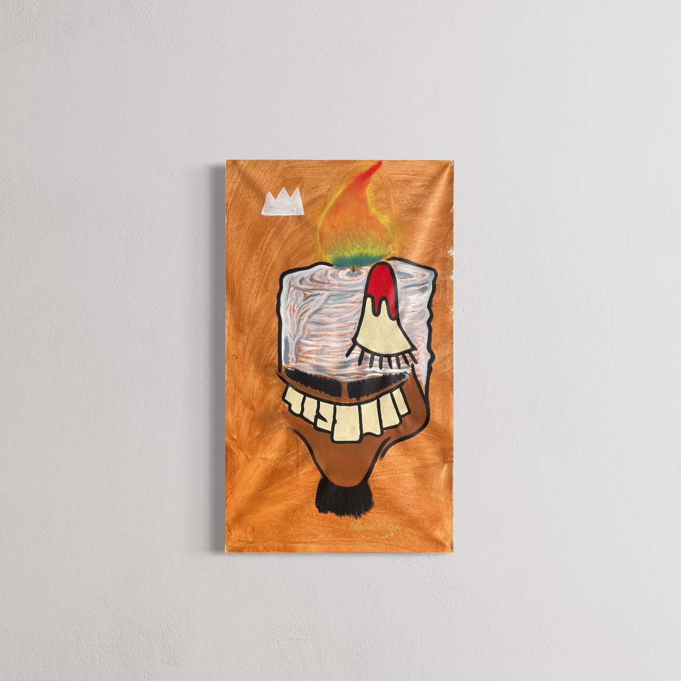 This piece grabs you instantly there’s something magnetic about that grin. It’s not just cheerful; it’s defiant. The face, almost sculptural in its layering, feels like it’s been through something. The flame rising from the head suggests a burning ambition, a mind lit with purpose. You get the sense that this character has faced storms but never let them dim their spirit.