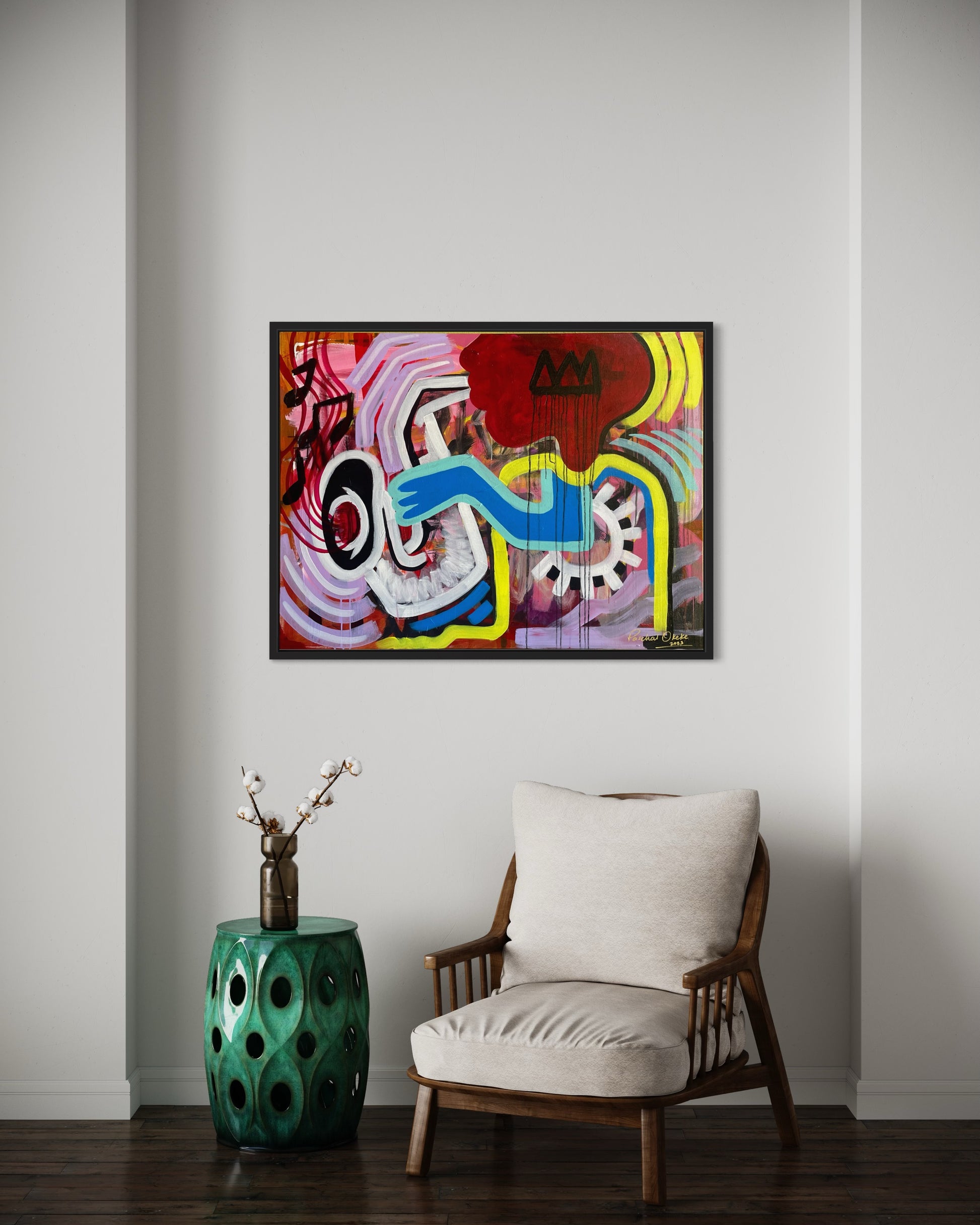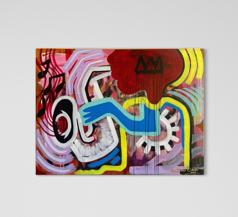 This painting was born from the love for music and the deep respect for time. The figure with the saxophone represents more than sound, it’s the soul expressing itself through rhythm and motion. The swirling colors around them are the vibrations of emotion, the energy that music stirs in us. Near the elbow, I placed a gear-like symbol to represent time because music lives in time, and time shapes every note, every breath. This piece is a tribute to those who feel music in their bones and understand that every moment is part of a larger rhythm we’re all playing in.