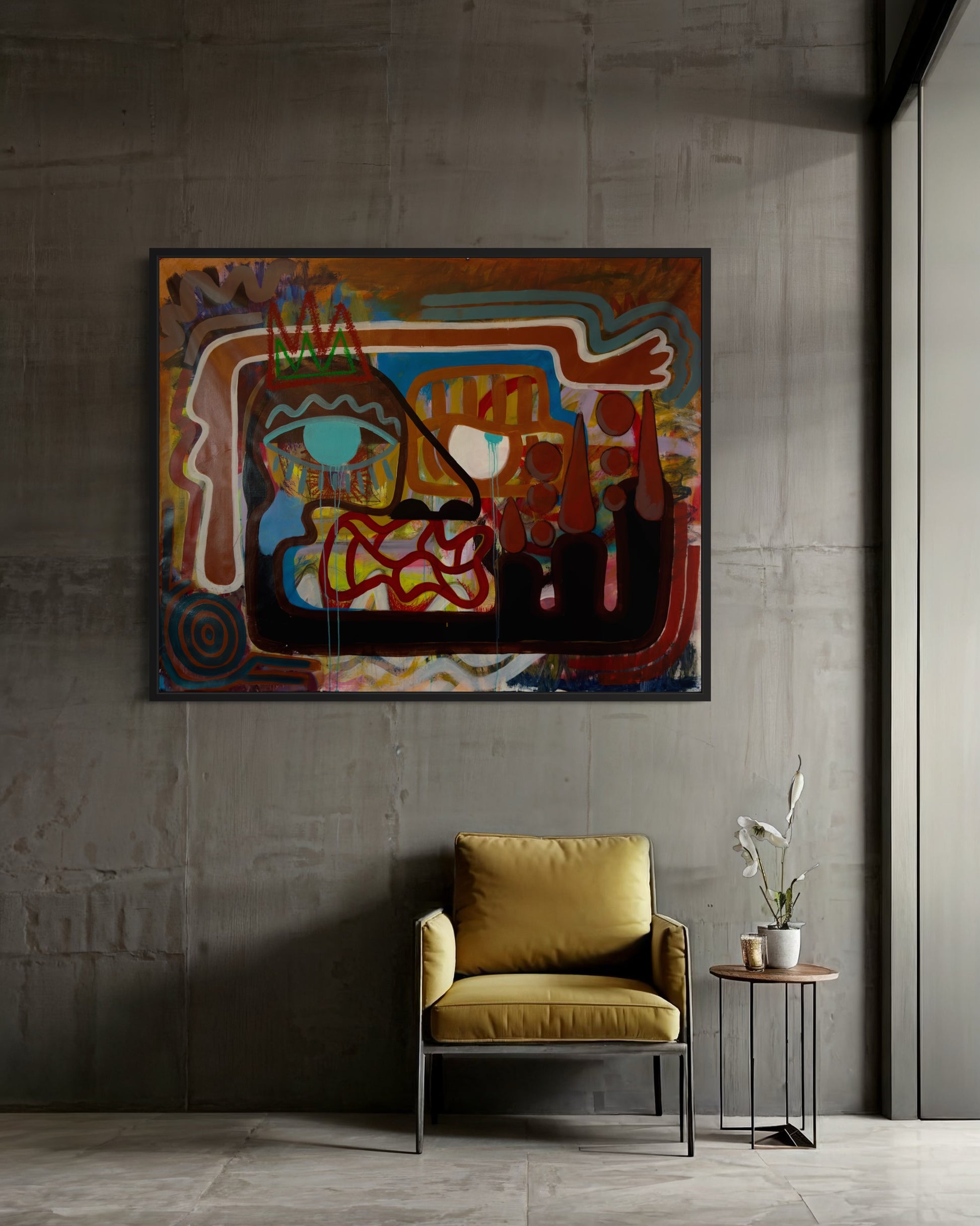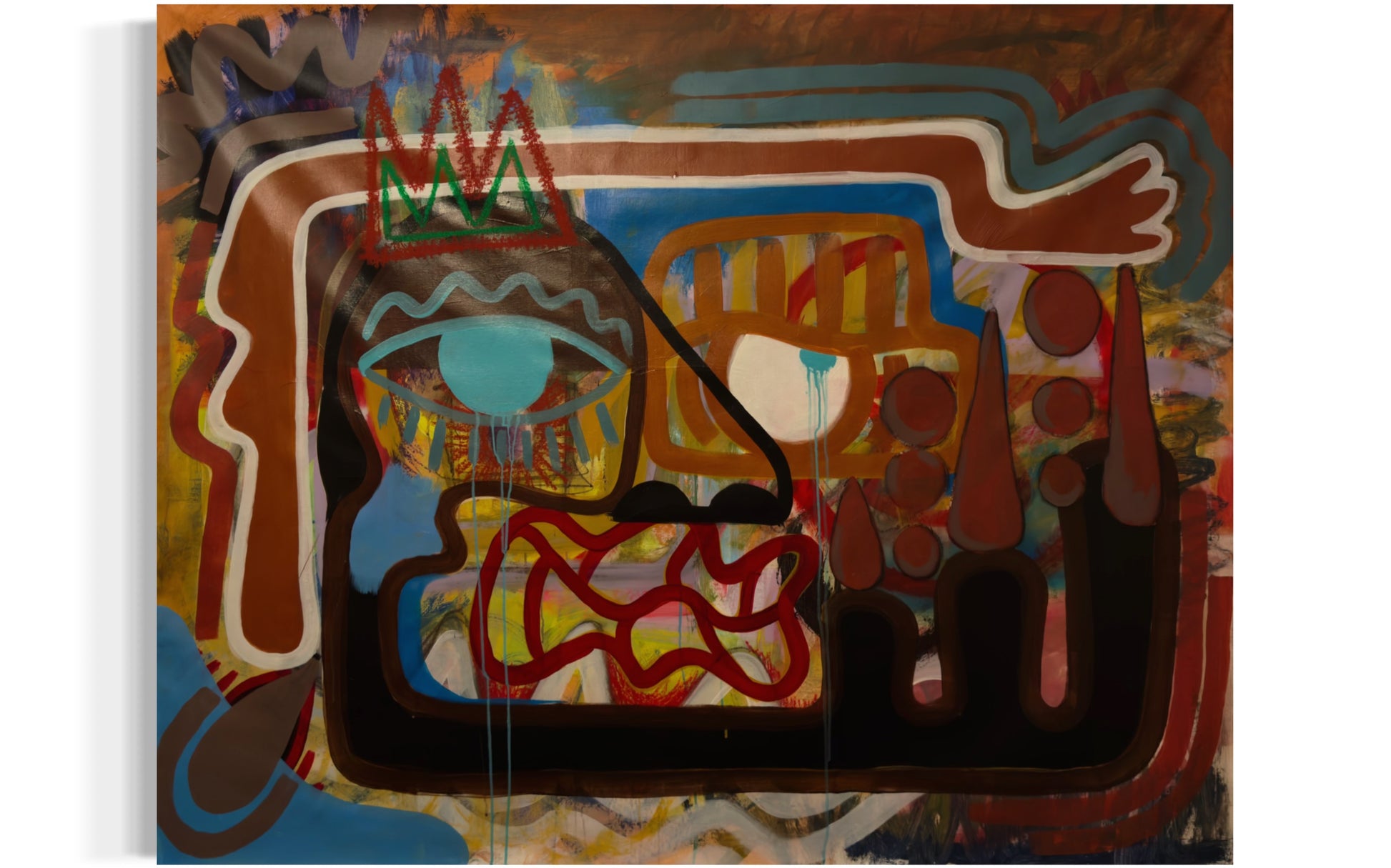 The central face, layered with emotion and color, seems to carry the weight of both roles watchful, expressive, and deeply rooted. The crown above the eye suggests dignity, perhaps the shared pride in building something lasting. The tears and tangled forms around the mouth hint at the complexity of family life love, struggle, sacrifice all woven into one.