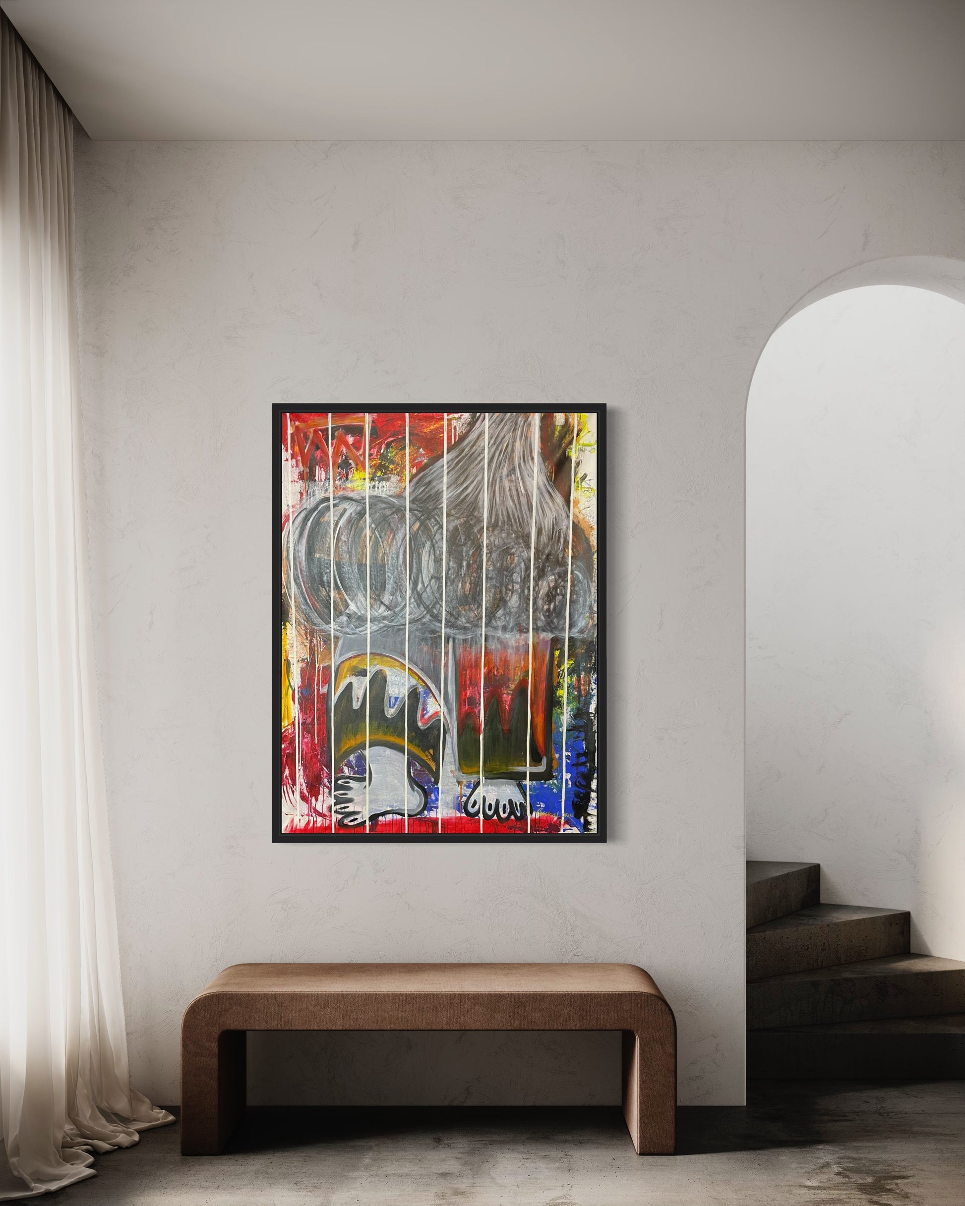 Standing before this piece, I feel the weight of suffocation. The white bars stretch down like prison gates, locking the figure in a cage of expectations. Above, a storm of chaotic lines swirls and presses downward, a heavy cloud of ideology that eats away at the form beneath. The figure bends, fractured, its colors bleeding as if dissolving under the strain. There’s a sense of combustion waiting to happen of a man held so tightly by invisible rules that he can no longer breathe. It is disintegration in slow motion, a portrait of men trapped, unraveling, and on the verge of explosion.